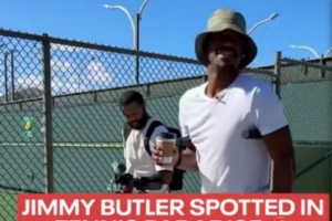 术后26天!巴特勒拄双拐亮相网球场 手持咖啡 拥抱好友兹维列夫