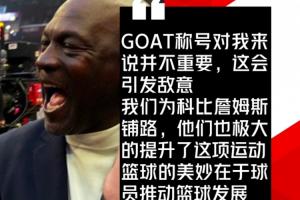 乔丹表示:“GOAT这个称号对我来说并不重要。对我来说,它也并不存在。我们为科比和勒布朗铺平了道路。篮球的美妙之处在于一代又一代球员不断推动这项运动的发展。但不要因此而贬低那些教你打球或你从他们那里学到东西的球员。我很想在我巅峰时期与勒布朗和科比交手,但这永远无法实现……我认为这会引发敌意。我对当今的球员们没有任何敌意,但确实有一些球员因为他们的贡献被遗忘而心存不满……我认为勒布朗的职业生涯非常了不起。我钦佩他所做的一切。同样,科比、KD等球员也是如此。我认为他们极大地提升了篮球这项运动。”