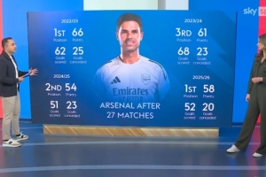 阿森纳本赛季英超27轮比赛战绩17胜7平3负积58分,天空体育统计了阿森纳近4个赛季的同期数据。