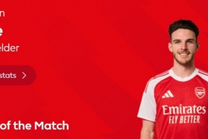 3次关键传球,英超官方:赖斯当选阿森纳1-1布伦特福德全场最佳