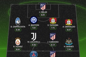 后卫:扎帕科斯塔(亚特兰大,8.38分)、巴斯托尼(国际米兰,7.84分)、塔普索巴(勒沃库森,7.91分)、格里马尔多(勒沃库森,8.07分)